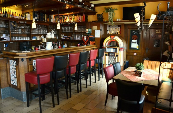 Grote bar, restaurant, TV-ruimte met luxe banken, biljart, dart, kleine garage